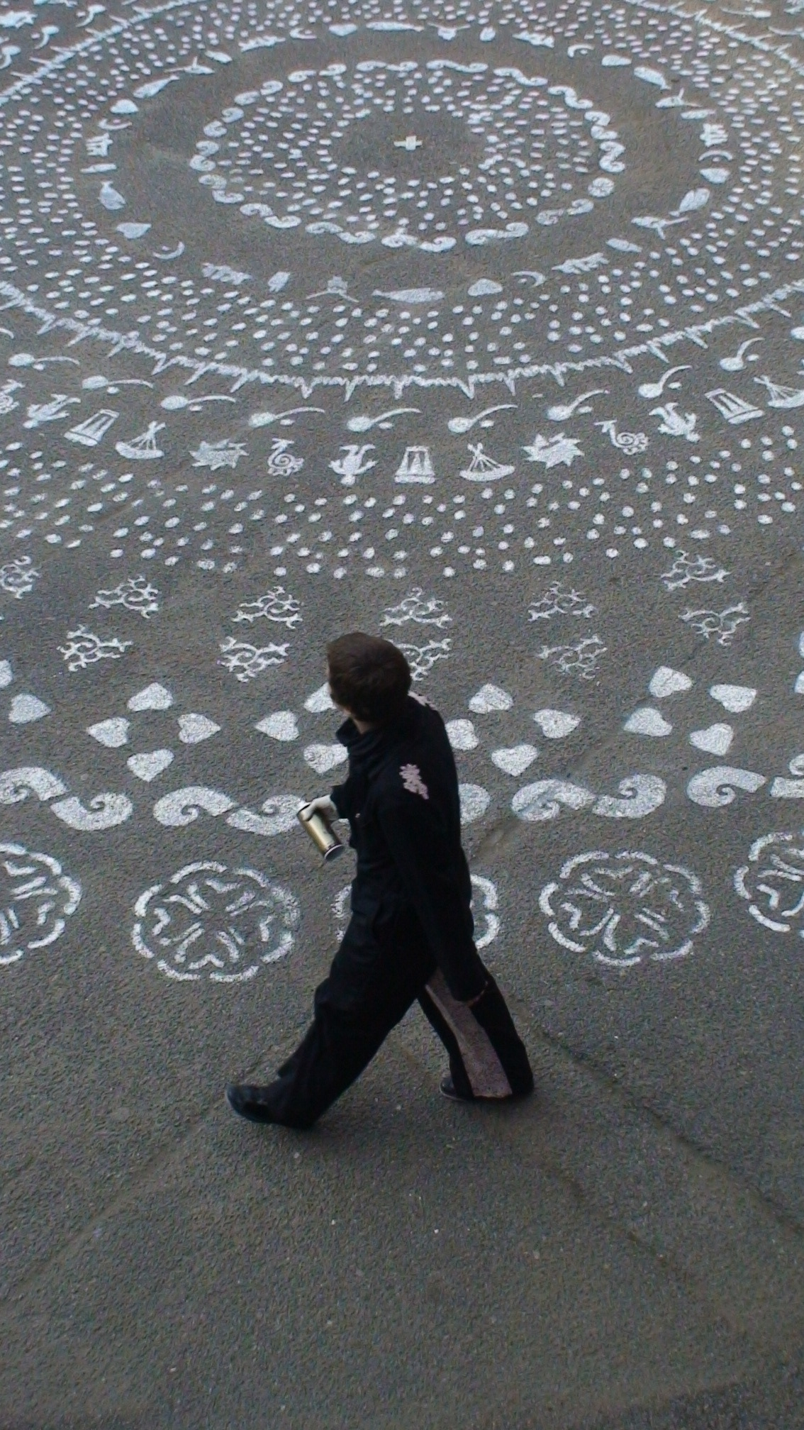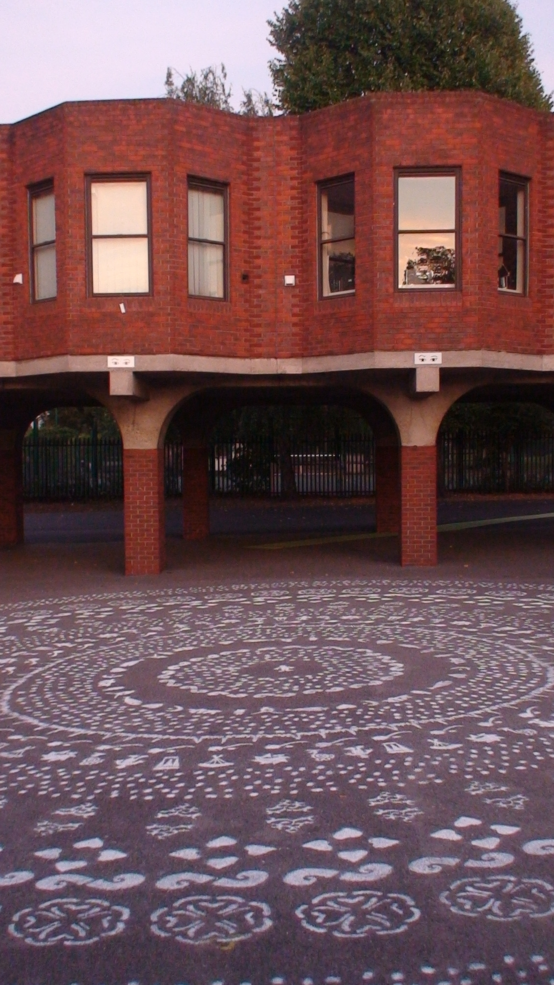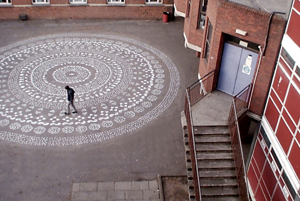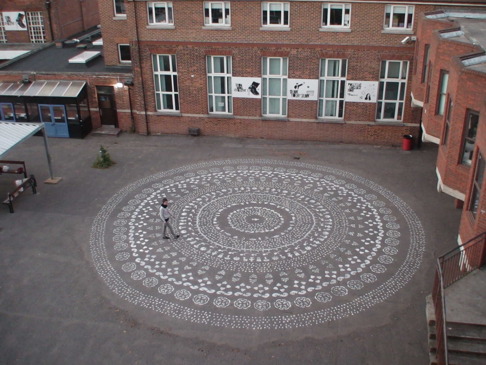 Na segunda etapa, realizada em 2008, foi criada na escola uma interferência arquitetônica bidimensional, que deveria funcionar como uma marca coletiva da comunidade escolar (professores, alunos e funcionários). O mote da criação foi gravar depoimentos colhidos pelos próprios alunos perguntando: “O que é paz pra você?”. A mesma pergunta levou a inúmeras respostas, de acordo com os valores de cada uma das culturas presentes na escola. Os alunos “traduziram” essas respostas em desenhos e, junto com a equipe do projeto, criaram uma mandala de 12m de diâmetro pintada no pátio.